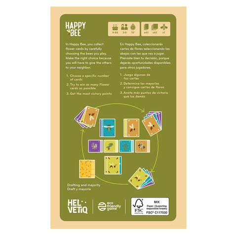 Happy Bee is a drafting game with a twist: you will select a different number of cards from your hand depending on the round (1, then 2, 3, 4, 5, 4, 3, 2 and 1).